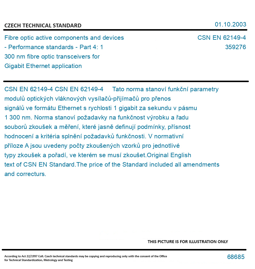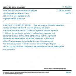 CSN EN 62149-4 Tato norma stanoví funkční parametry modulů optických vláknových vysílačů-přijímačů pro přenos signálů ve formátu Ethernet s rychlosti 1 gigabit za sekundu v pásmu 1 300 nm. Norma stanoví požadavky na funkčnost výrobku a řadu souborů zkoušek a měření, které jasně definují podmínky, přísnost hodnocení a kritéria splnění požadavků funkčnosti. V normativní příloze A jsou uvedeny počty zkoušených vzorků pro jednotlivé typy zkoušek a pořadí, ve kterém se musí zkoušet. Original English text of CSN EN Standard. The price of the Standard included all amendments and correcturs.