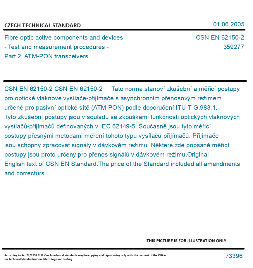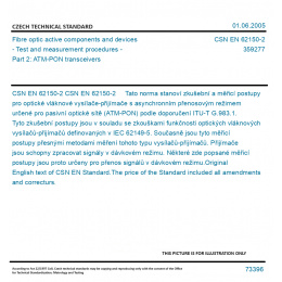 CSN EN 62150-2 Tato norma stanoví zkušební a měřicí postupy pro optické vláknové vysílače-přijímače s asynchronním přenosovým režimem určené pro pasivní optické sítě (ATM-PON) podle doporučení ITU-T G.983.1. Tyto zkušební postupy jsou v souladu se zkouškami funkčnosti optických vláknových vysílačů-přijímačů definovaných v IEC 62149-5. Současně jsou tyto měřicí postupy přesnými metodami měření tohoto typu vysílačů-přijímačů. Přijímače jsou schopny zpracovat signály v dávkovém režimu. Některé zde popsané měřicí postupy jsou proto určeny pro přenos signálů v dávkovém režimu. Original English text of CSN EN Standard. The price of the Standard included all amendments and correcturs.