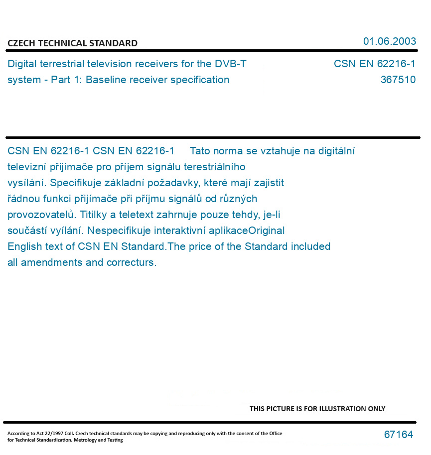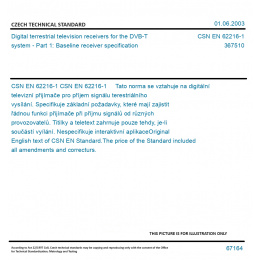 CSN EN 62216-1 Tato norma se vztahuje na digitální televizní přijímače pro příjem signálu terestriálního vysílání. Specifikuje základní požadavky, které mají zajistit řádnou funkci přijímače při příjmu signálů od různých provozovatelů. Titilky a teletext zahrnuje pouze tehdy, je-li součástí vyílání. Nespecifikuje interaktivní aplikace Original English text of CSN EN Standard. The price of the Standard included all amendments and correcturs.