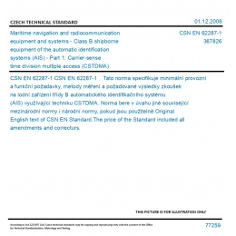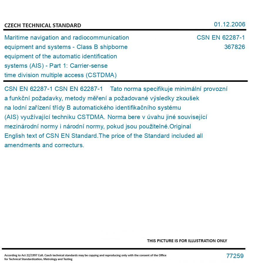 >CSN Standards>36 ELECTRICAL ENGINEERING>3678 Navigation and safety systems>CSN EN 62287-1 - Maritime navigation and radiocommunication equipment and systems - Class B shipborne equipment of the automatic identification systems (AIS) - Part 1: Carrier-sense time division multiple access (CSTDMA) techniques
