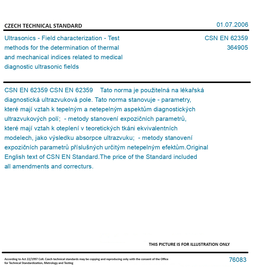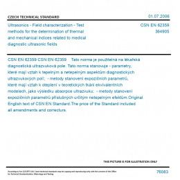 CSN EN 62359 Tato norma je použitelná na lékařská diagnostická ultrazvuková pole. Tato norma stanovuje - parametry, které mají vztah k tepelným a netepelným aspektům diagnostických ultrazvukových polí; - metody stanovení expozičních parametrů, které mají vztah k oteplení v teoretických tkáni ekvivalentních modelech, jako výsledku absorpce ultrazvuku; - metody stanovení expozičních parametrů příslušných určitým netepelným efektům. Original English text of CSN EN Standard. The price of the Standard included all amendments and correcturs.