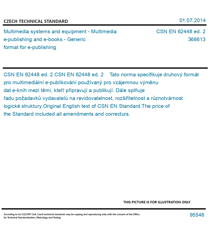 CSN EN 62448 ed. 2 Tato norma specifikuje druhový formát pro multimediální e-publikování používaný pro vzájemnou výměnu dat e-knih mezi těmi, kteří připravují a publikují. Dále splňuje řadu požadavků vydavatelů na revidovatelnost, rozšiřitelnost a různotvárnost logické struktury. Original English text of CSN EN Standard. The price of the Standard included all amendments and correcturs.