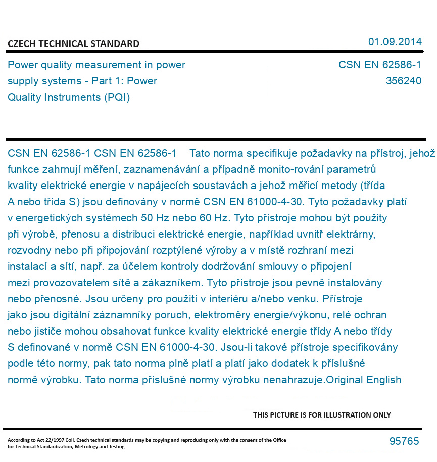 CSN EN 62586-1 Tato norma specifikuje požadavky na přístroj, jehož funkce zahrnují měření, zaznamenávání a případně monito-rování parametrů kvality elektrické energie v napájecích soustavách a jehož měřicí metody (třída A nebo třída S) jsou definovány v normě CSN EN 61000-4-30. Tyto požadavky platí v energetických systémech 50 Hz nebo 60 Hz. Tyto přístroje mohou být použity při výrobě, přenosu a distribuci elektrické energie, například uvnitř elektrárny, rozvodny nebo při připojování rozptýlené výroby a v místě rozhraní mezi instalací a sítí, např. za účelem kontroly dodržování smlouvy o připojení mezi provozovatelem sítě a zákazníkem. Tyto přístroje jsou pevně instalovány nebo přenosné. Jsou určeny pro použití v interiéru a/nebo venku. Přístroje jako jsou digitální záznamníky poruch, elektroměry energie/výkonu, relé ochran nebo jističe mohou obsahovat funkce kvality elektrické energie třídy A nebo třídy S definované v normě CSN EN 61000-4-30. Jsou-li takové přístroje specifikovány podle této normy, pak tato norma plně platí a platí jako dodatek k příslušné normě výrobku. Tato norma příslušné normy výrobku nenahrazuje. Original English text of CSN EN Standard. The price of the Standard included all amendments and correcturs.