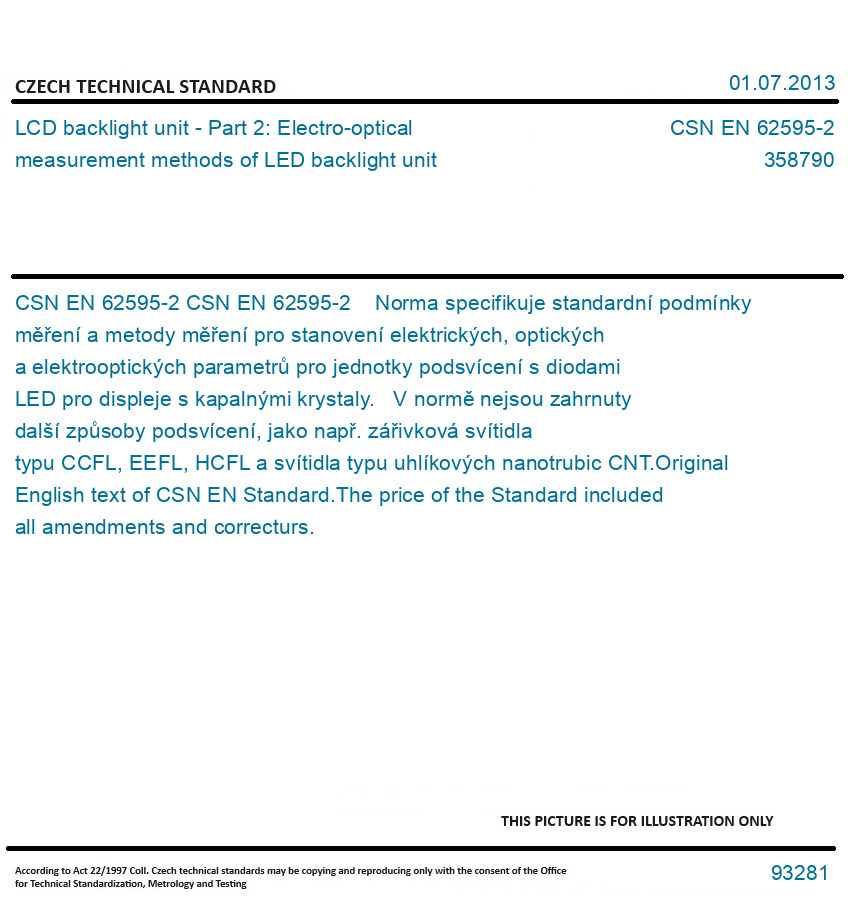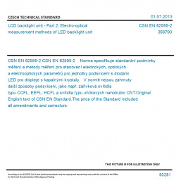 CSN EN 62595-2 Norma specifikuje standardní podmínky měření a metody měření pro stanovení elektrických, optických a elektrooptických parametrů pro jednotky podsvícení s diodami LED pro displeje s kapalnými krystaly. V normě nejsou zahrnuty další způsoby podsvícení, jako např. zářivková svítidla typu CCFL, EEFL, HCFL a svítidla typu uhlíkových nanotrubic CNT. Original English text of CSN EN Standard. The price of the Standard included all amendments and correcturs.