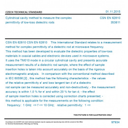 CSN EN 62810 This International Standard relates to a measurement method for complex permittivity of a dielectric rod at microwave frequency. This method has been developed to evaluate the dielectric properties of low-loss materials in coaxial cables and electronic devices used in microwave systems. It uses the TM010 mode in a circular cylindrical cavity and presents accurate measurement results of a dielectric rod sample, where the effect of sample insertion holes is taken into account accurately on the basis of the rigorous electromagnetic analysis. In comparison with the conventional method described in IEC 60556 [2] , this method has the following characteristics: - the values of the relative permittivity e' and loss tangent tan d of a dielectric rod sample can be measured accurately and non-destructively; - the measurement accuracy is within 1,0 % for e' and within 20 % for tan d; - the effect of sample insertion holes is corrected using correction charts presented; - this method is applicable for the measurements on the following condition: frequency: 1 GHz <= f <= 10 GHz; relative permittivity: 1 <= e' <= 100; loss tangent: 10E-4 <= tan d <= 10E-1. Original English text of CSN EN Standard. The price of the Standard included all amendments and correcturs.