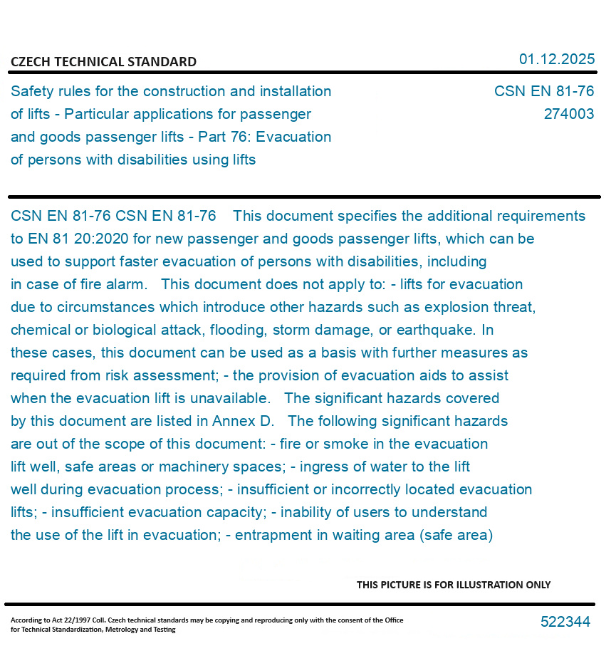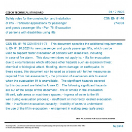 CSN EN 81-76 This document specifies the additional requirements to EN 81 20:2020 for new passenger and goods passenger lifts, which can be used to support faster evacuation of persons with disabilities, including in case of fire alarm. This document does not apply to: - lifts for evacuation due to circumstances which introduce other hazards such as explosion threat, chemical or biological attack, flooding, storm damage, or earthquake. In these cases, this document can be used as a basis with further measures as required from risk assessment; - the provision of evacuation aids to assist when the evacuation lift is unavailable. The significant hazards covered by this document are listed in Annex D. The following significant hazards are out of the scope of this document: - fire or smoke in the evacuation lift well, safe areas or machinery spaces; - ingress of water to the lift well during evacuation process; - insufficient or incorrectly located evacuation lifts; - insufficient evacuation capacity; - inability of users to understand the use of the lift in evacuation; - entrapment in waiting area (safe area) due to absence of lift service or adjacent stairs; - structural collapse or failure of building services (including public supply network, lighting, ventilation) before the evacuation using lifts has been completed; - presence of harmful gases, potentially explosive atmosphere, extreme climate conditions, transport of dangerous goods; - unavailability of the evacuation lift. This document is not applicable to evacuation lifts manufactured before the date of its publication.