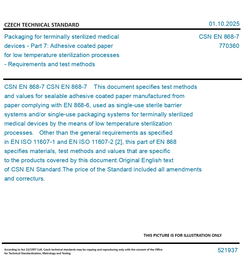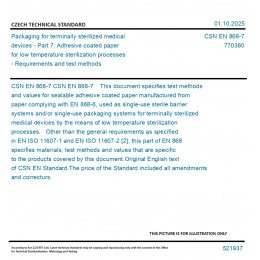 CSN EN 868-7 This document specifies test methods and values for sealable adhesive coated paper manufactured from paper complying with EN 868-6, used as single-use sterile barrier systems and/or single-use packaging systems for terminally sterilized medical devices by the means of low temperature sterilization processes. Other than the general requirements as specified in EN ISO 11607-1 and EN ISO 11607-2 [2], this part of EN 868 specifies materials, test methods and values that are specific to the products covered by this document. Original English text of CSN EN Standard. The price of the Standard included all amendments and correcturs.