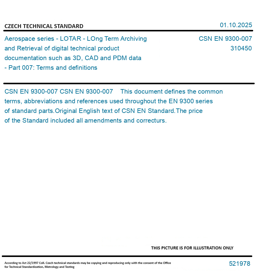 CSN EN 9300-007 This document defines the common terms, abbreviations and references used throughout the EN 9300 series of standard parts. Original English text of CSN EN Standard. The price of the Standard included all amendments and correcturs.