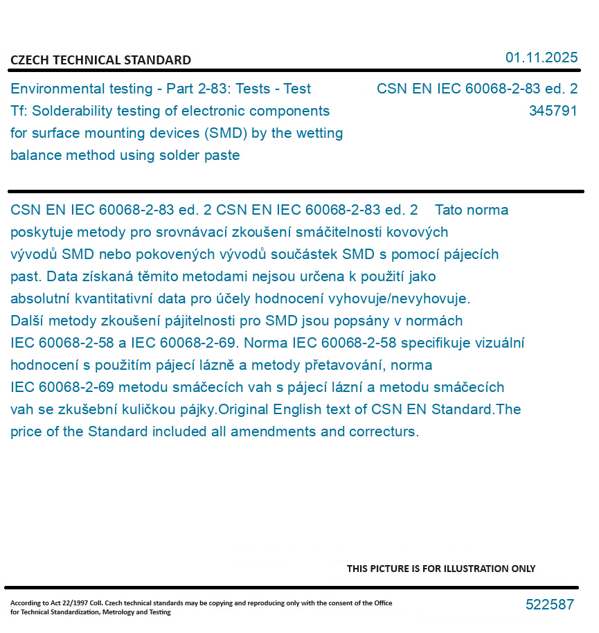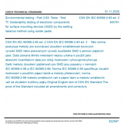 CSN EN IEC 60068-2-83 ed. 2 Tato norma poskytuje metody pro srovnávací zkoušení smáčitelnosti kovových vývodů SMD nebo pokovených vývodů součástek SMD s pomocí pájecích past. Data získaná těmito metodami nejsou určena k použití jako absolutní kvantitativní data pro účely hodnocení vyhovuje/nevyhovuje. Další metody zkoušení pájitelnosti pro SMD jsou popsány v normách IEC 60068-2-58 a IEC 60068-2-69. Norma IEC 60068-2-58 specifikuje vizuální hodnocení s použitím pájecí lázně a metody přetavování, norma IEC 60068-2-69 metodu smáčecích vah s pájecí lázní a metodu smáčecích vah se zkušební kuličkou pájky. Original English text of CSN EN Standard. The price of the Standard included all amendments and correcturs.