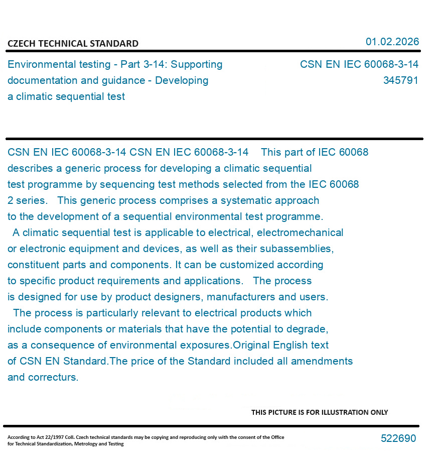 CSN EN IEC 60068-3-14 This part of IEC 60068 describes a generic process for developing a climatic sequential test programme by sequencing test methods selected from the IEC 60068 2 series. This generic process comprises a systematic approach to the development of a sequential environmental test programme. A climatic sequential test is applicable to electrical, electromechanical or electronic equipment and devices, as well as their subassemblies, constituent parts and components. It can be customized according to specific product requirements and applications. The process is designed for use by product designers, manufacturers and users. The process is particularly relevant to electrical products which include components or materials that have the potential to degrade, as a consequence of environmental exposures.