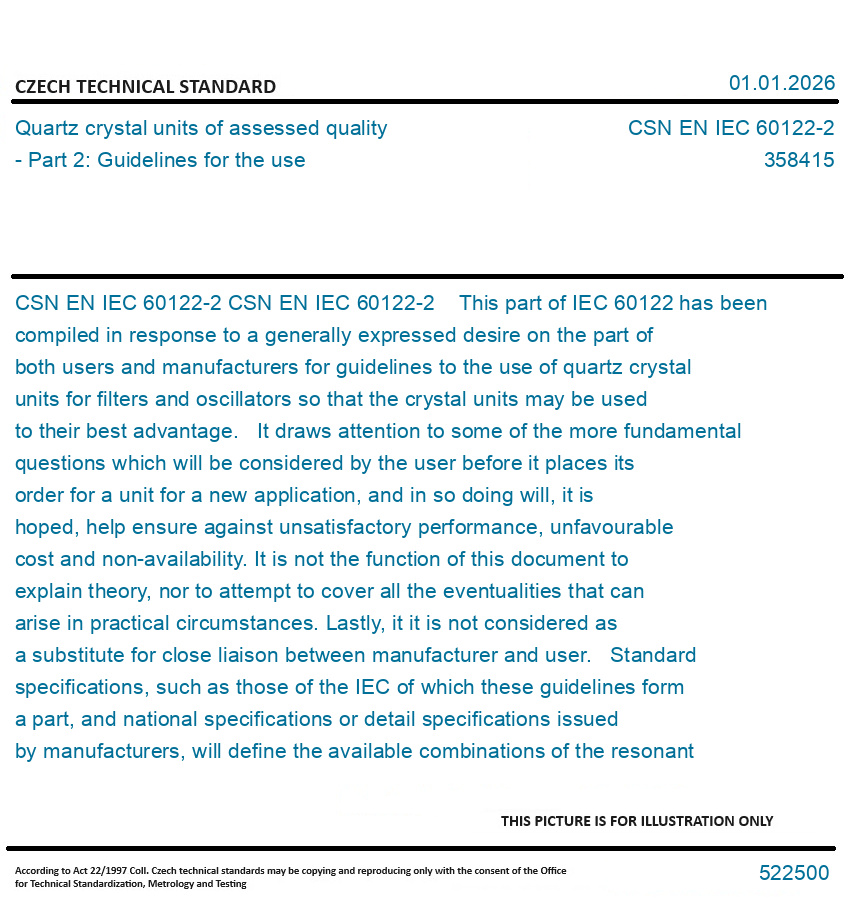 CSN EN IEC 60122-2 This part of IEC 60122 has been compiled in response to a generally expressed desire on the part of both users and manufacturers for guidelines to the use of quartz crystal units for filters and oscillators so that the crystal units may be used to their best advantage. It draws attention to some of the more fundamental questions which will be considered by the user before it places its order for a unit for a new application, and in so doing will, it is hoped, help ensure against unsatisfactory performance, unfavourable cost and non-availability. It is not the function of this document to explain theory, nor to attempt to cover all the eventualities that can arise in practical circumstances. Lastly, it it is not considered as a substitute for close liaison between manufacturer and user. Standard specifications, such as those of the IEC of which these guidelines form a part, and national specifications or detail specifications issued by manufacturers, will define the available combinations of the resonant characteristics and the temperature characteristic. These specifications are compiled to include a wide range of quartz crystal units with standardized performances. It cannot be over-emphasized that it is the responsibility of the user, wherever possible, to select the quartz crystal units from these specifications, when available, even if it can lead to making small modifications to the circuit to enable the use of standard resonators. This applies particularly to the selection of the nominal frequency.