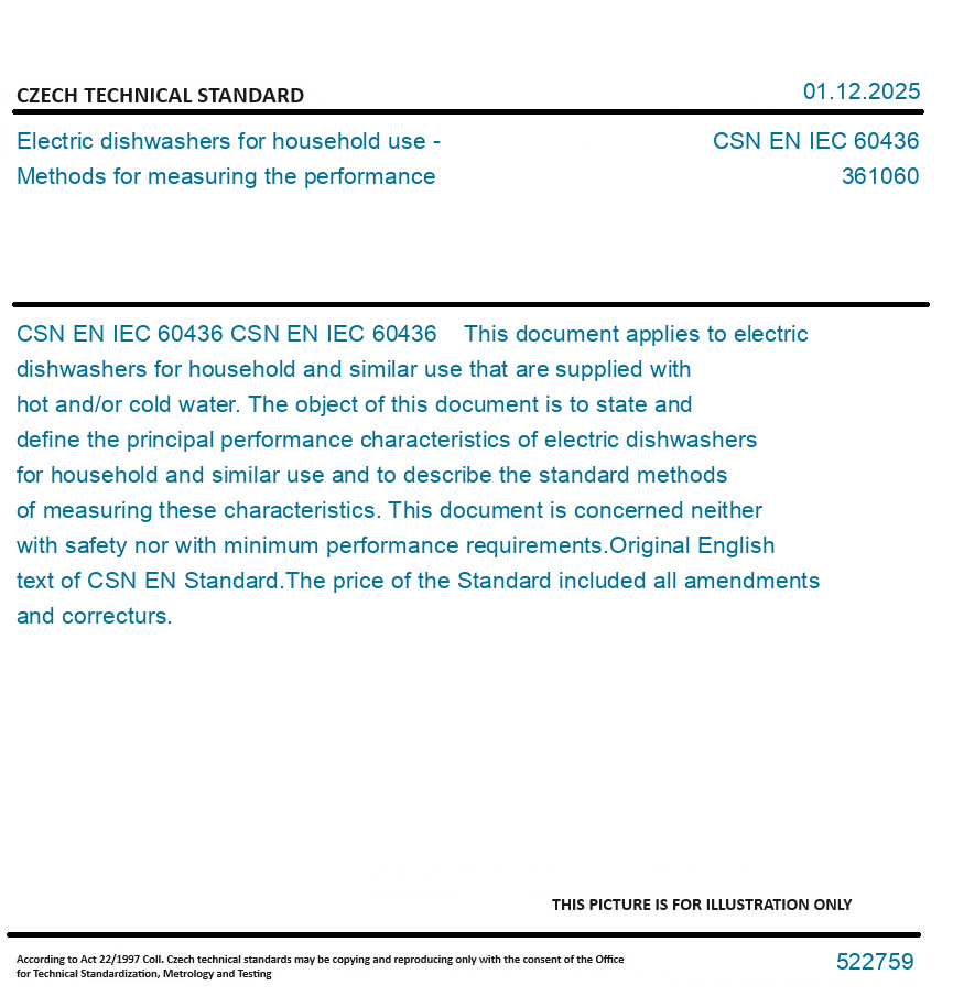 CSN EN IEC 60436 This document applies to electric dishwashers for household and similar use that are supplied with hot and/or cold water. The object of this document is to state and define the principal performance characteristics of electric dishwashers for household and similar use and to describe the standard methods of measuring these characteristics. This document is concerned neither with safety nor with minimum performance requirements. Original English text of CSN EN Standard. The price of the Standard included all amendments and correcturs.