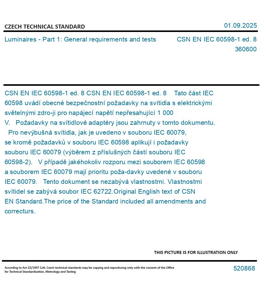 CSN EN IEC 60598-1 ed. 8 Tato část IEC 60598 uvádí obecné bezpečnostní požadavky na svítidla s elektrickými světelnými zdro-ji pro napájecí napětí nepřesahující 1 000 V. Požadavky na svítidlové adaptéry jsou zahrnuty v tomto dokumentu. Pro nevýbušná svítidla, jak je uvedeno v souboru IEC 60079, se kromě požadavků v souboru IEC 60598 aplikují i požadavky souboru IEC 60079 (výběrem z příslušných částí souboru IEC 60598-2). V případě jakéhokoliv rozporu mezi souborem IEC 60598 a souborem IEC 60079 mají prioritu poža-davky uvedené v souboru IEC 60079. Tento dokument se nezabývá vlastnostmi. Vlastnostmi svítidel se zabývá soubor IEC 62722. Original English text of CSN EN Standard. The price of the Standard included all amendments and correcturs.