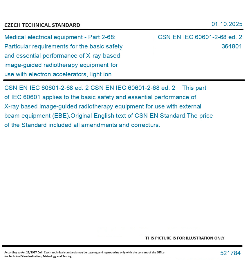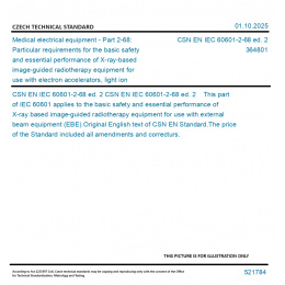 CSN EN IEC 60601-2-68 ed. 2 This part of IEC 60601 applies to the basic safety and essential performance of X-ray based image-guided radiotherapy equipment for use with external beam equipment (EBE). Original English text of CSN EN Standard. The price of the Standard included all amendments and correcturs.