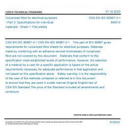 CSN EN IEC 60667-3-1 This part of IEC 60667 gives requirements for vulcanized fibre sheets for electrical purposes. Materials made by combining with an adhesive several thicknesses of vulcanized fibre are not covered by this document. Materials that conform to this specification meet established levels of performance. However, the selection of a material by a user for a specific application is based on the actual requirements necessary for adequate performance in that application and not based on this specification alone. Safety warning: it is the responsibility of the user of the methods contained or referred to in this document to ensure that they are used in a safe manner. Original English text of CSN EN Standard. The price of the Standard included all amendments and correcturs.