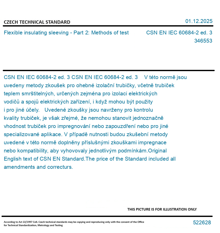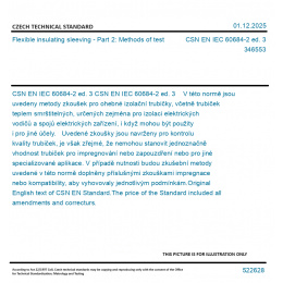 CSN EN IEC 60684-2 ed. 3 V této normě jsou uvedeny metody zkoušek pro ohebné izolační trubičky, včetně trubiček teplem smrštitelných, určených zejména pro izolaci elektrických vodičů a spojů elektrických zařízení, i když mohou být použity i pro jiné účely. Uvedené zkoušky jsou navrženy pro kontrolu kvality trubiček, je však zřejmé, že nemohou stanovit jednoznačně vhodnost trubiček pro impregnování nebo zapouzdření nebo pro jiné specializované aplikace. V případě nutnosti budou zkušební metody uvedené v této normě doplněny příslušnými zkouškami impregnace nebo kompatibility, aby vyhovovaly jednotlivým podmínkám. Original English text of CSN EN Standard. The price of the Standard included all amendments and correcturs.