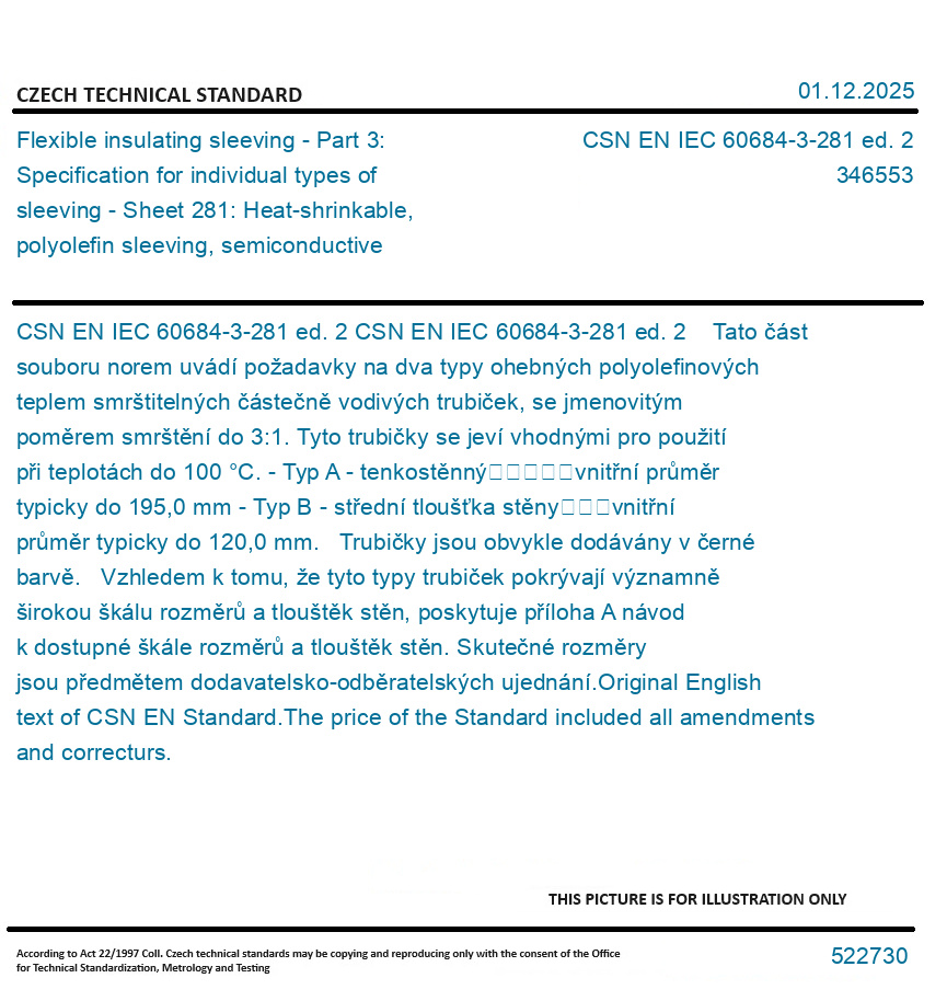 CSN EN IEC 60684-3-281 ed. 2 Tato část souboru norem uvádí požadavky na dva typy ohebných polyolefinových teplem smrštitelných částečně vodivých trubiček, se jmenovitým poměrem smrštění do 3:1. Tyto trubičky se jeví vhodnými pro použití při teplotách do 100 °C. - Typ A - tenkostěnný vnitřní průměr typicky do 195,0 mm - Typ B - střední tloušťka stěny vnitřní průměr typicky do 120,0 mm. Trubičky jsou obvykle dodávány v černé barvě. Vzhledem k tomu, že tyto typy trubiček pokrývají významně širokou škálu rozměrů a tlouštěk stěn, poskytuje příloha A návod k dostupné škále rozměrů a tlouštěk stěn. Skutečné rozměry jsou předmětem dodavatelsko-odběratelských ujednání. Original English text of CSN EN Standard. The price of the Standard included all amendments and correcturs.