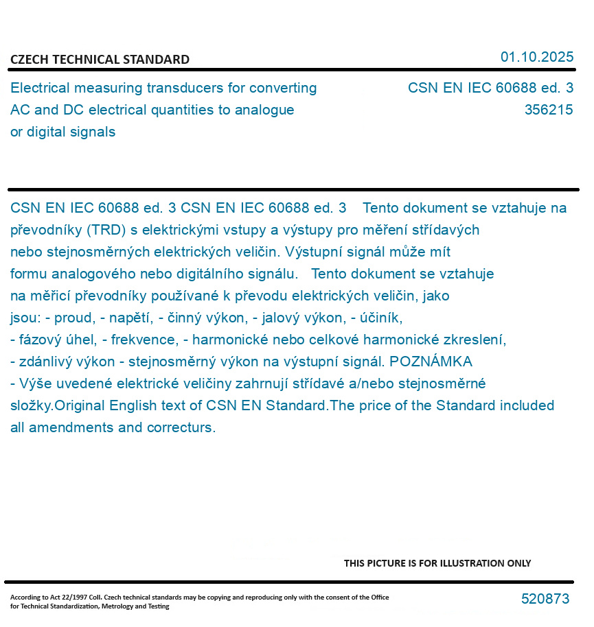 CSN EN IEC 60688 ed. 3 Tento dokument se vztahuje na převodníky (TRD) s elektrickými vstupy a výstupy pro měření střídavých nebo stejnosměrných elektrických veličin. Výstupní signál může mít formu analogového nebo digitálního signálu. Tento dokument se vztahuje na měřicí převodníky používané k převodu elektrických veličin, jako jsou: - proud, - napětí, - činný výkon, - jalový výkon, - účiník, - fázový úhel, - frekvence, - harmonické nebo celkové harmonické zkreslení, - zdánlivý výkon - stejnosměrný výkon na výstupní signál. POZNÁMKA - Výše uvedené elektrické veličiny zahrnují střídavé a/nebo stejnosměrné složky. Original English text of CSN EN Standard. The price of the Standard included all amendments and correcturs.