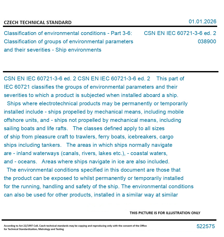 CSN EN IEC 60721-3-6 ed. 2 This part of IEC 60721 classifies the groups of environmental parameters and their severities to which a product is subjected when installed aboard a ship. Ships where electrotechnical products may be permanently or temporarily installed include - ships propelled by mechanical means, including mobile offshore units, and - ships not propelled by mechanical means, including sailing boats and life rafts. The classes defined apply to all sizes of ship from pleasure craft to trawlers, ferry boats, icebreakers, cargo ships including tankers. The areas in which ships normally navigate are - inland waterways (canals, rivers, lakes etc.), - coastal waters, and - oceans. Areas where ships navigate in ice are also included. The environmental conditions specified in this document are those that the product can be exposed to whilst permanently or temporarily installed for the running, handling and safety of the ship. The environmental conditions can also be used for other products, installed in a similar way at similar locations. Accidental incidents are not included but it can be important to take their occurrence into account for products vital to the safety of the ship. The classification also does not cover the effects of water pressure on submerged products. Classification of storage and transportation environmental conditions are given in other subparts of the IEC 60721 3 series.