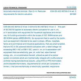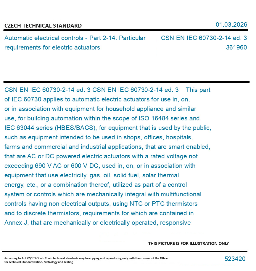 CSN EN IEC 60730-2-14 ed. 3 This part of IEC 60730 applies to automatic electric actuators for use in, on, or in association with equipment for household appliance and similar use, for building automation within the scope of ISO 16484 series and IEC 63044 series (HBES/BACS), for equipment that is used by the public, such as equipment intended to be used in shops, offices, hospitals, farms and commercial and industrial applications, that are smart enabled, that are AC or DC powered electric actuators with a rated voltage not exceeding 690 V AC or 600 V DC, used in, on, or in association with equipment that use electricity, gas, oil, solid fuel, solar thermal energy, etc., or a combination thereof, utilized as part of a control system or controls which are mechanically integral with multifunctional controls having non-electrical outputs, using NTC or PTC thermistors and to discrete thermistors, requirements for which are contained in Annex J, that are mechanically or electrically operated, responsive to or controlling such characteristics as temperature, pressure, passage of time, humidity, light, electrostatic effects, flow, or liquid level, current, voltage, acceleration, or combinations thereof and as well as manual controls when such are electrically and/or mechanically integral with automatic controls. This document applies to the inherent safety of automatic electric actuators, and functional safety of automatic electric actuators and safety related systems, controls where the performance (for example the effect of EMC phenomena) of the product can impair the overall safety and performance of the controlled system, the operating values, operating times, and operating sequences where such are associated with equipment safety. This document specifies the requirements for construction, operation and testing of automatic electric actuators used in, on, or in association with an equipment.