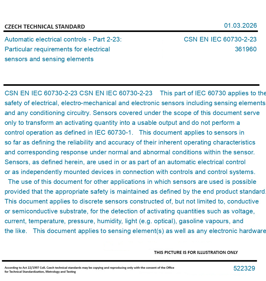 CSN EN IEC 60730-2-23 This part of IEC 60730 applies to the safety of electrical, electro-mechanical and electronic sensors including sensing elements and any conditioning circuitry. Sensors covered under the scope of this document serve only to transform an activating quantity into a usable output and do not perform a control operation as defined in IEC 60730-1. This document applies to sensors in so far as defining the reliability and accuracy of their inherent operating characteristics and corresponding response under normal and abnormal conditions within the sensor. Sensors, as defined herein, are used in or as part of an automatic electrical control or as independently mounted devices in connection with controls and control systems. The use of this document for other applications in which sensors are used is possible provided that the appropriate safety is maintained as defined by the end product standard. This document applies to discrete sensors constructed of, but not limited to, conductive or semiconductive substrate, for the detection of activating quantities such as voltage, current, temperature, pressure, humidity, light (e.g. optical), gasoline vapours, and the like. This document applies to sensing element(s) as well as any electronic hardware, software, or other conditioning circuits that are inherent to the sensor and relied upon to reliably transform the input signal into a useable response signal (output) for functional safety purposes. Conditioning circuits that are inseparable from the control for which the sensing element relies upon to perform its desired function are evaluated by the requirements of the relevant control Part 2 standard and/or IEC 60730-1. Throughout this document, whenever it is indicated that the IEC 60730-1 requirements are applicable, the term "control(s)", is replaced by the term "sensor(s)", and the term "equipment" is replaced by the term "control", as they are used in IEC 60730-1, respectively, unless otherwise specified herein. This document does not apply to sensors explicitly described in another relevant part 2 of the IEC 60730 series.