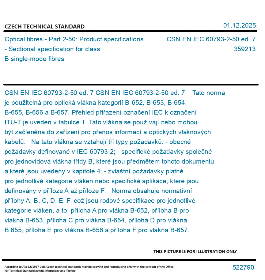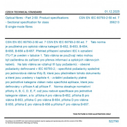 CSN EN IEC 60793-2-50 ed. 7 Tato norma je použitelná pro optická vlákna kategorií B-652, B-653, B-654, B-655, B-656 a B-657. Přehled přiřazení označení IEC k označení ITU-T je uveden v tabulce 1. Tato vlákna se používají nebo mohou být začleněna do zařízení pro přenos informací a optických vláknových kabelů. Na tato vlákna se vztahují tři typy požadavků: - obecné požadavky definované v IEC 60793-2; - specifické požadavky společné pro jednovidová vlákna třídy B, které jsou předmětem tohoto dokumentu a které jsou uvedeny v kapitole 4; - zvláštní požadavky platné pro jednotlivé kategorie vláken nebo specifické aplikace, které jsou definovány v příloze A až příloze F. Norma obsahuje normativní přílohy A, B, C, D, E, F, což jsou rodové specifikace pro jednotlivé kategorie vláken, a to: příloha A pro vlákna B-652, příloha B pro vlákna B-653, příloha C pro vlákna B-654, příloha D pro vlákna B 655, příloha E pro vlákna B-656 a příloha F pro vlákna B-657. Dále norma obsahuje informativní přílohu G, která uvádí informace o návrhu systému s vláknem kategorie B-655. Original English text of CSN EN Standard. The price of the Standard included all amendments and correcturs.