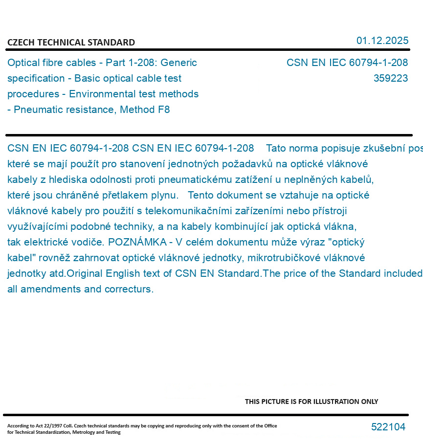 CSN EN IEC 60794-1-208 Tato norma popisuje zkušební postupy, které se mají použít pro stanovení jednotných požadavků na optické vláknové kabely z hlediska odolnosti proti pneumatickému zatížení u neplněných kabelů, které jsou chráněné přetlakem plynu. Tento dokument se vztahuje na optické vláknové kabely pro použití s telekomunikačními zařízeními nebo přístroji využívajícími podobné techniky, a na kabely kombinující jak optická vlákna, tak elektrické vodiče. POZNÁMKA - V celém dokumentu může výraz "optický kabel" rovněž zahrnovat optické vláknové jednotky, mikrotrubičkové vláknové jednotky atd. Original English text of CSN EN Standard. The price of the Standard included all amendments and correcturs.