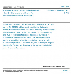 CSN EN IEC 60966-3-1 ed. 4 This part of IEC 60966 is a blank detail specification that relates to semi-flexible coaxial cable assemblies operating in the transverse electromagnetic mode (TEM). The creation of a uniform layout and style of detail specifications is determined by the use of a blank detail specification pro forma. The detail specification can be prepared by the insertion of data into the pro forma by a national organization, a manufacturer, or a user. Original English text of CSN EN Standard. The price of the Standard included all amendments and correcturs.