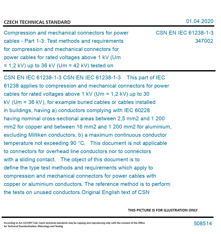 CSN EN IEC 61238-1-3 This part of IEC 61238 applies to compression and mechanical connectors for power cables for rated voltages above 1 kV (Um = 1,2 kV) up to 30 kV (Um = 36 kV), for example buried cables or cables installed in buildings, having a) conductors complying with IEC 60228 having nominal cross-sectional areas between 2,5 mm2 and 1 200 mm2 for copper and between 16 mm2 and 1 200 mm2 for aluminium, excluding Milliken conductors; b) a maximum continuous conductor temperature not exceeding 90 °C. This document is not applicable to connectors for overhead line conductors nor to connectors with a sliding contact. The object of this document is to define the type test methods and requirements which apply to compression and mechanical connectors for power cables with copper or aluminium conductors. The reference method is to perform the tests on unused conductors. Original English text of CSN EN Standard. The price of the Standard included all amendments and correcturs.