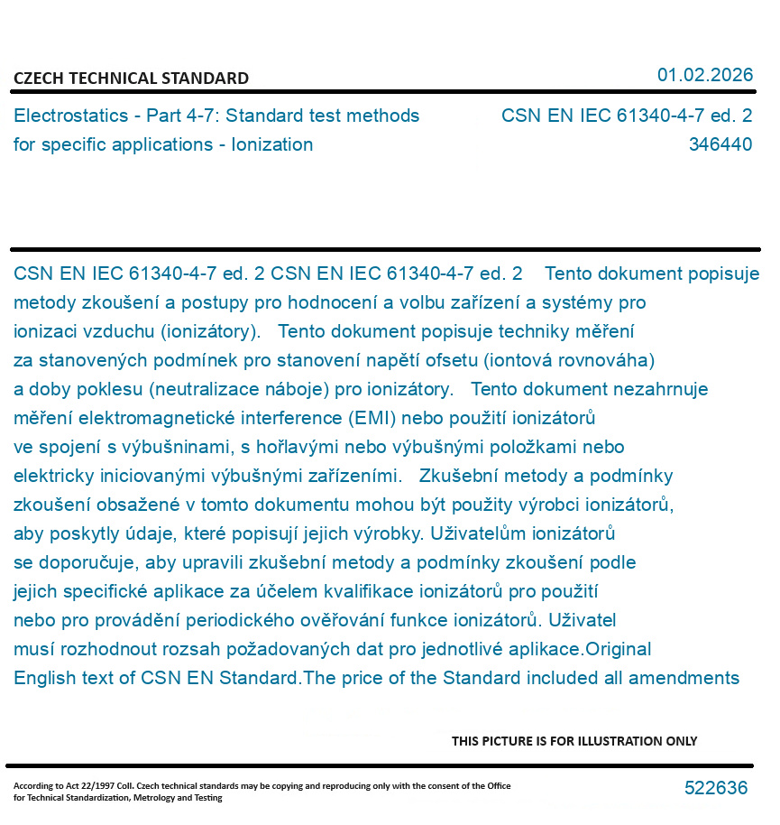 CSN EN IEC 61340-4-7 ed. 2 Tento dokument popisuje metody zkoušení a postupy pro hodnocení a volbu zařízení a systémy pro ionizaci vzduchu (ionizátory). Tento dokument popisuje techniky měření za stanovených podmínek pro stanovení napětí ofsetu (iontová rovnováha) a doby poklesu (neutralizace náboje) pro ionizátory. Tento dokument nezahrnuje měření elektromagnetické interference (EMI) nebo použití ionizátorů ve spojení s výbušninami, s hořlavými nebo výbušnými položkami nebo elektricky iniciovanými výbušnými zařízeními. Zkušební metody a podmínky zkoušení obsažené v tomto dokumentu mohou být použity výrobci ionizátorů, aby poskytly údaje, které popisují jejich výrobky. Uživatelům ionizátorů se doporučuje, aby upravili zkušební metody a podmínky zkoušení podle jejich specifické aplikace za účelem kvalifikace ionizátorů pro použití nebo pro provádění periodického ověřování funkce ionizátorů. Uživatel musí rozhodnout rozsah požadovaných dat pro jednotlivé aplikace.