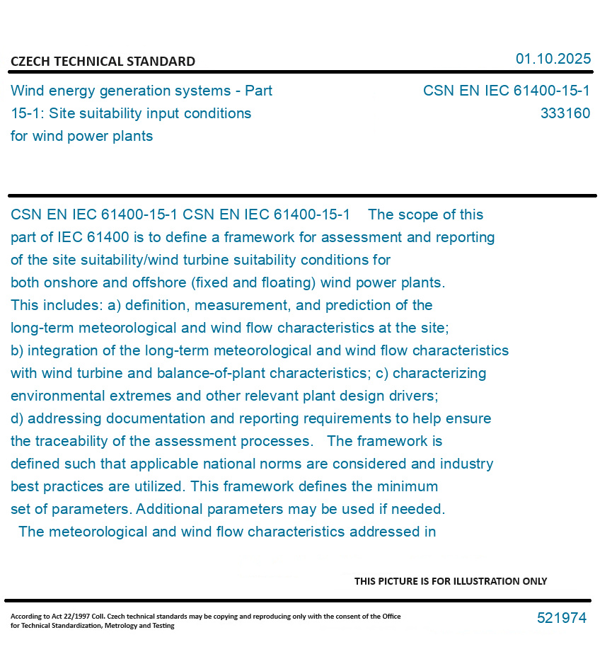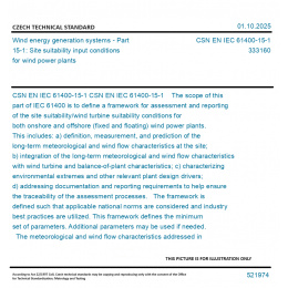 CSN EN IEC 61400-15-1 The scope of this part of IEC 61400 is to define a framework for assessment and reporting of the site suitability/wind turbine suitability conditions for both onshore and offshore (fixed and floating) wind power plants. This includes: a) definition, measurement, and prediction of the long-term meteorological and wind flow characteristics at the site; b) integration of the long-term meteorological and wind flow characteristics with wind turbine and balance-of-plant characteristics; c) characterizing environmental extremes and other relevant plant design drivers; d) addressing documentation and reporting requirements to help ensure the traceability of the assessment processes. The framework is defined such that applicable national norms are considered and industry best practices are utilized. This framework defines the minimum set of parameters. Additional parameters may be used if needed. The meteorological and wind flow characteristics addressed in this document relate to wind conditions, where parameters such as wind speed, wind direction, turbulence intensity, wind shear, inflow angle, air density or air temperature are included to the extent that they affect the structural integrity of a wind turbine. According to IEC 61400-1, IEC 61400-3-1 and IEC TS 61400-3-2, site specific conditions are wind conditions, marine conditions, other environmental conditions, soil conditions and electrical conditions. All of these site-specific conditions other than site specific wind conditions and related atmospheric variables addressed herein are out of scope for this document. This document is framed to complement and support the scope of related IEC 61400 series by defining environmental input conditions. It is not intended to supersede the design and suitability requirements presented in those documents. Specific analytical and modelling procedures as described in IEC 61400-1, IEC 61400-2, IEC 61400-3-1 and IEC TS 61400-3-2 are excluded from the scope of this document. Original English text of CSN EN Standard. The price of the Standard included all amendments and correcturs.