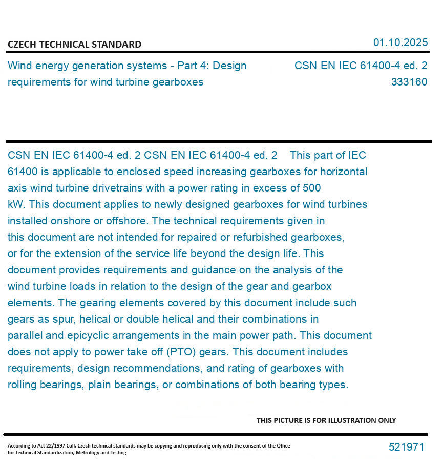 CSN EN IEC 61400-4 ed. 2 This part of IEC 61400 is applicable to enclosed speed increasing gearboxes for horizontal axis wind turbine drivetrains with a power rating in excess of 500 kW. This document applies to newly designed gearboxes for wind turbines installed onshore or offshore. The technical requirements given in this document are not intended for repaired or refurbished gearboxes, or for the extension of the service life beyond the design life. This document provides requirements and guidance on the analysis of the wind turbine loads in relation to the design of the gear and gearbox elements. The gearing elements covered by this document include such gears as spur, helical or double helical and their combinations in parallel and epicyclic arrangements in the main power path. This document does not apply to power take off (PTO) gears. This document includes requirements, design recommendations, and rating of gearboxes with rolling bearings, plain bearings, or combinations of both bearing types. Also included are requirements and guidance on the engineering of shafts, shaft hub interfaces, lubrication, wind turbine controller interface, and the gear case structure to achieve a design that is capable of withstanding the environment and operating conditions of a wind turbine. Requirements for dynamic analysis of the gearbox within the wind turbine system are specified for the purpose of identifying load levels exceeding the predictions of the global aeroelastic simulation. The analysis of noise transmission and emission (e.g. tonal emission at gear mesh frequencies) is not within the scope of this edition of the document. Further, this document provides requirements and guidance on gearbox design verification, prototype testing and production testing, as well as consideration of design for service and maintenance. Original English text of CSN EN Standard. The price of the Standard included all amendments and correcturs.
