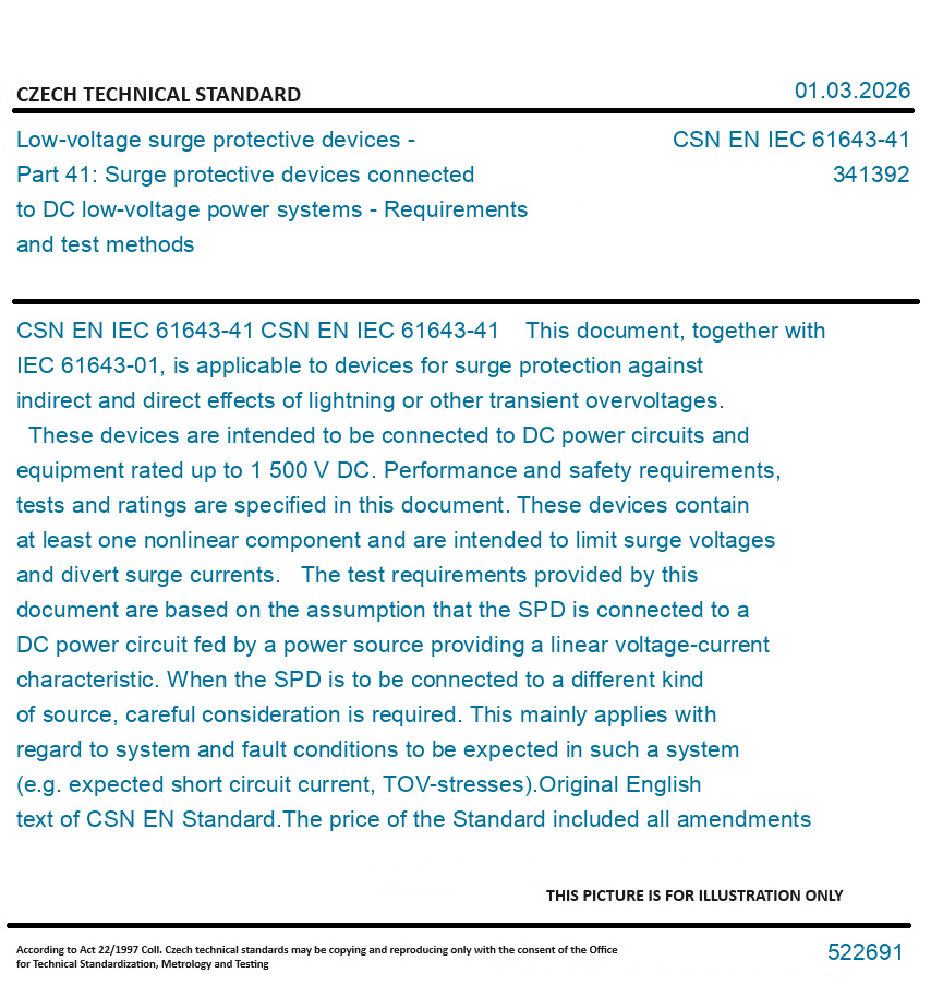 CSN EN IEC 61643-41 This document, together with IEC 61643-01, is applicable to devices for surge protection against indirect and direct effects of lightning or other transient overvoltages. These devices are intended to be connected to DC power circuits and equipment rated up to 1 500 V DC. Performance and safety requirements, tests and ratings are specified in this document. These devices contain at least one nonlinear component and are intended to limit surge voltages and divert surge currents. The test requirements provided by this document are based on the assumption that the SPD is connected to a DC power circuit fed by a power source providing a linear voltage-current characteristic. When the SPD is to be connected to a different kind of source, careful consideration is required. This mainly applies with regard to system and fault conditions to be expected in such a system (e.g. expected short circuit current, TOV-stresses).