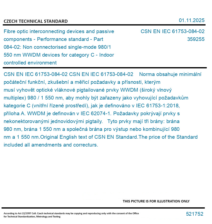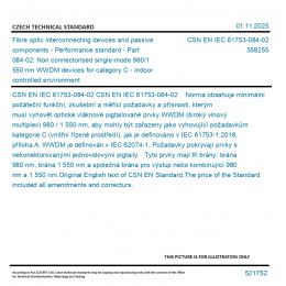 CSN EN IEC 61753-084-02 Norma obsahuje minimální počáteční funkční, zkušební a měřicí požadavky a přísnosti, kterým musí vyhovět optické vláknové pigtailované prvky WWDM (široký vlnový multiplex) 980 / 1 550 nm, aby mohly být zařazeny jako vyhovující požadavkům kategorie C (vnitřní řízené prostředí), jak je definováno v IEC 61753-1:2018, příloha A. WWDM je definován v IEC 62074-1. Požadavky pokrývají prvky s nekonektorovanými jednovidovými pigtaily. Tyto prvky mají tři brány: brána 980 nm, brána 1 550 nm a společná brána pro výstup nebo kombinující 980 nm a 1 550 nm. Original English text of CSN EN Standard. The price of the Standard included all amendments and correcturs.