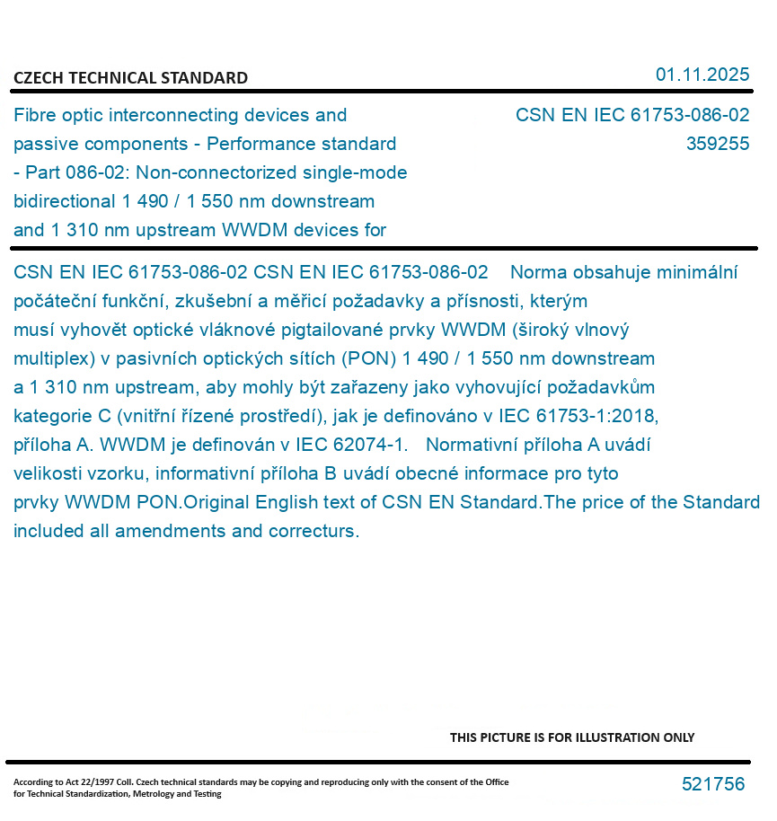 >CSN Standards>35 ELECTRICAL ENGINEERING>3592 Cables and elements for fibre optics>CSN EN IEC 61753-086-02 - Fibre optic interconnecting devices and passive components - Performance standard - Part 086-02: Non-connectorized single-mode bidirectional 1 490 / 1 550 nm downstream and 1 310 nm upstream WWDM devices for category C - Indoor controlled environment