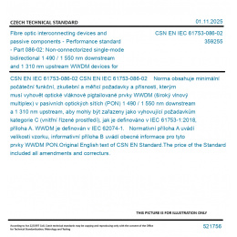 CSN EN IEC 61753-086-02 Norma obsahuje minimální počáteční funkční, zkušební a měřicí požadavky a přísnosti, kterým musí vyhovět optické vláknové pigtailované prvky WWDM (široký vlnový multiplex) v pasivních optických sítích (PON) 1 490 / 1 550 nm downstream a 1 310 nm upstream, aby mohly být zařazeny jako vyhovující požadavkům kategorie C (vnitřní řízené prostředí), jak je definováno v IEC 61753-1:2018, příloha A. WWDM je definován v IEC 62074-1. Normativní příloha A uvádí velikosti vzorku, informativní příloha B uvádí obecné informace pro tyto prvky WWDM PON. Original English text of CSN EN Standard. The price of the Standard included all amendments and correcturs.