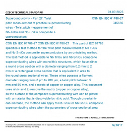 CSN EN IEC 61788-27 This part of IEC 61788 specifies a test method for the twist pitch measurement of Nb Ti/Cu and Nb Sn/Cu composite superconductors by an untwisting method. The test method is applicable to Nb Ti/Cu and Nb Sn/Cu composite superconducting wires with monolithic structures, which have either a round cross section with a diameter ranging from 0,2 mm to 2 mm or a rectangular cross section that is equivalent in area to the round cross sectional wires. These wires possess a filament diameter ranging from 6 µm to 200 µm, a twist pitch between 5 mm and 50 mm, and a matrix of copper or copper alloy. This document uses nitric acid to remove the matrix (copper or copper alloy), so the surface of the composite superconducting wire can be plated with a material that is dissolvable by nitric acid. Though uncertainty can increase, the method can apply to Nb Ti/Cu or Nb Sn/Cu composite superconducting wires when the parameters of cross-sectional area, filament diameter and twist pitch are out of the limit. The test method specified in this document is expected to apply to other types of composite superconducting wires after some appropriate modifications. Original English text of CSN EN Standard. The price of the Standard included all amendments and correcturs.