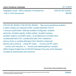 CSN EN IEC 62228-3 Tato norma specifikuje zkušební a měřicí metody pro hodnocení EMC vysílačů-přijímačů CAN IO v síťových podmínkách. Definuje zkušební konfigurace, zkušební podmínky, zkušební signály, kritéria selhání, zkušební postupy, zkušební sestavy a zkušební desky. Je použitelná pro normalizované vysílače-přijímače CAN, vysílače-přijímače CAN s částečnou síťovou funkcí a vysílače-přijímače CAN s flexibilní schopností přenosu dat a pokrývá - emise RF rušení, - imunitu proti RF rušení, - imunitu proti impulzům, a - imunitu proti elektrostatickým výbojům (ESD). Original English text of CSN EN Standard. The price of the Standard included all amendments and correcturs.