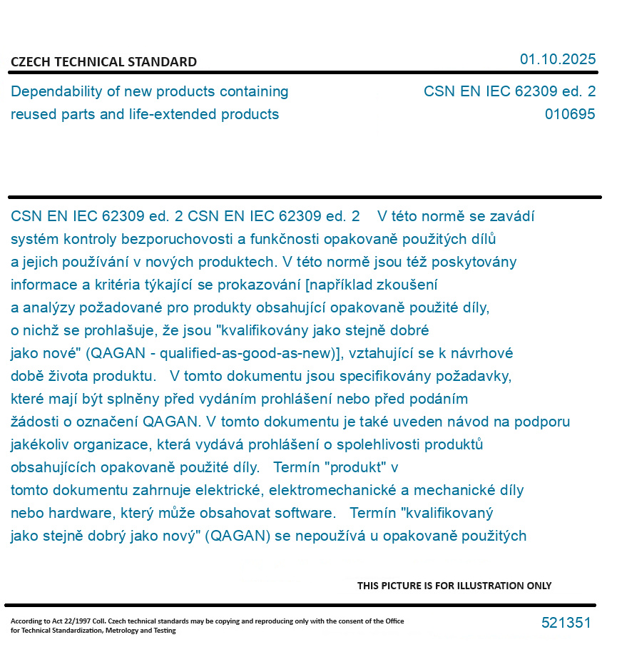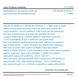 CSN EN IEC 62309 ed. 2 V této normě se zavádí systém kontroly bezporuchovosti a funkčnosti opakovaně použitých dílů a jejich používání v nových produktech. V této normě jsou též poskytovány informace a kritéria týkající se prokazování [například zkoušení a analýzy požadované pro produkty obsahující opakovaně použité díly, o nichž se prohlašuje, že jsou "kvalifikovány jako stejně dobré jako nové" (QAGAN - qualified-as-good-as-new)], vztahující se k návrhové době života produktu. V tomto dokumentu jsou specifikovány požadavky, které mají být splněny před vydáním prohlášení nebo před podáním žádosti o označení QAGAN. V tomto dokumentu je také uveden návod na podporu jakékoliv organizace, která vydává prohlášení o spolehlivosti produktů obsahujících opakovaně použité díly. Termín "produkt" v tomto dokumentu zahrnuje elektrické, elektromechanické a mechanické díly nebo hardware, který může obsahovat software. Termín "kvalifikovaný jako stejně dobrý jako nový" (QAGAN) se nepoužívá u opakovaně použitých materiálů nebo u velkých konstrukcí a velkých systémů, ani se nevztahuje na softwarové produkty, koncepty nebo představy. Účelem tohoto dokumentu je zkouškami a analýzou zajistit, že je bezporuchovost a funkčnost nového produktu obsahujícího opakovaně použité díly srovnatelná s produktem, který obsahuje pouze nové díly. To by mělo opravňovat výrobce k poskytnutí plné záruky na produkt s díly "kvalifikovanými jako stejně dobré jako nové" (QAGAN) příštímu zákazníkovi. V příloze A jsou popsány případy prodloužení užitečné doby života renovací, aktualizací, modernizací, údržbou a použitím jako partiový produkt. Tyto pojmy jsou definovány a jsou stanoveny požadavky na používání daného termínu s odkazem na tento dokument. Original English text of CSN EN Standard. The price of the Standard included all amendments and correcturs.