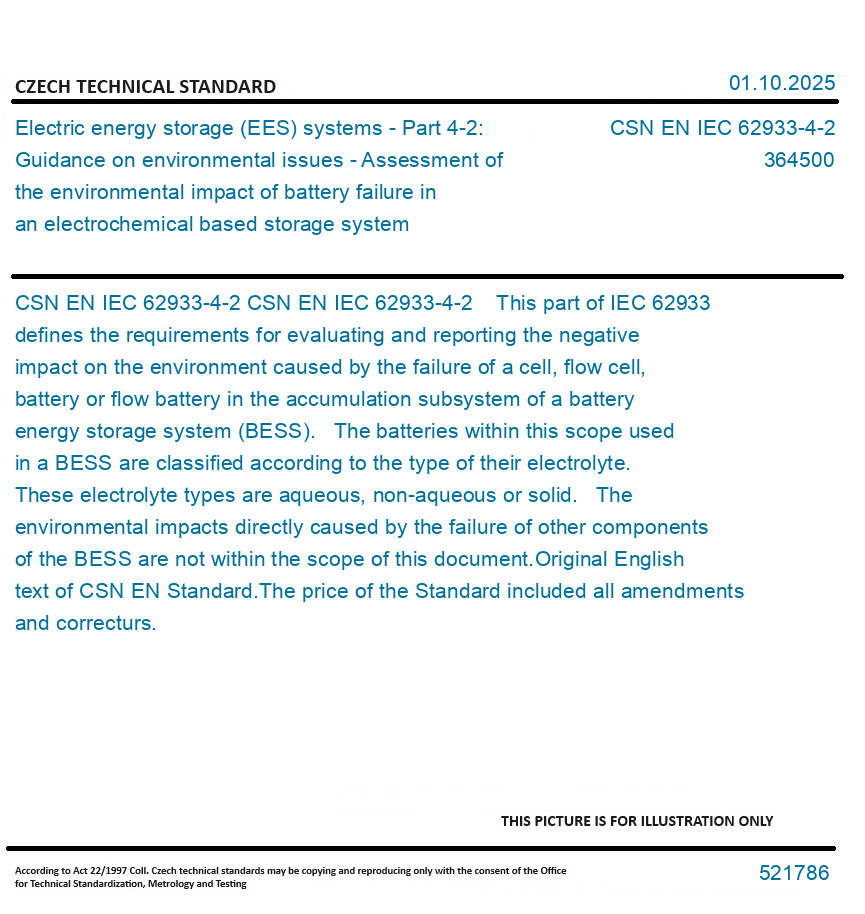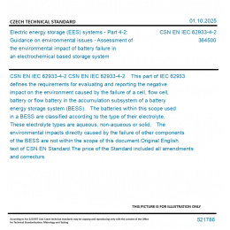 CSN EN IEC 62933-4-2 This part of IEC 62933 defines the requirements for evaluating and reporting the negative impact on the environment caused by the failure of a cell, flow cell, battery or flow battery in the accumulation subsystem of a battery energy storage system (BESS). The batteries within this scope used in a BESS are classified according to the type of their electrolyte. These electrolyte types are aqueous, non-aqueous or solid. The environmental impacts directly caused by the failure of other components of the BESS are not within the scope of this document. Original English text of CSN EN Standard. The price of the Standard included all amendments and correcturs.