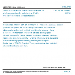 CSN EN IEC 63244-1 Tato norma stanovuje obecné požadavky a specifikace polovodičových součástek pro hodnocení výkonnosti a spolehlivosti systémů bezdrátového přenosu výkonu a nabíjení. Pro hodnocení výkonnosti tato část zahrnuje popis různých parametrů a značek, obecná systémová schémata, zkušební nastavení a zkušební podmínky. V tomto dokumentu je také popsáno členění technologií pro bezdrátový přenos výkonu. Original English text of CSN EN Standard. The price of the Standard included all amendments and correcturs.