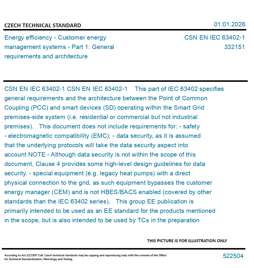 CSN EN IEC 63402-1 This part of IEC 63402 specifies general requirements and the architecture between the Point of Common Coupling (PCC) and smart devices (SD) operating within the Smart Grid premises-side system (i.e. residential or commercial but not industrial premises). This document does not include requirements for: - safety - electromagnetic compatibility (EMC); - data security, as it is assumed that the underlying protocols will take the data security aspect into account NOTE - Although data security is not within the scope of this document, Clause 4 provides some high-level design guidelines for data security. - special equipment (e.g. legacy heat pumps) with a direct physical connection to the grid, as such equipment bypasses the customer energy manager (CEM) and is not HBES/BACS enabled (covered by other standards than the IEC 63402 series). This group EE publication is primarily intended to be used as an EE standard for the products mentioned in the scope, but is also intended to be used by TCs in the preparation of publications for products which are included in the boundary mentioned in the scope of this document.