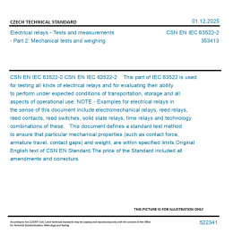 CSN EN IEC 63522-2 This part of IEC 63522 is used for testing all kinds of electrical relays and for evaluating their ability to perform under expected conditions of transportation, storage and all aspects of operational use. NOTE - Examples for electrical relays in the sense of this document include electromechanical relays, reed relays, reed contacts, reed switches, solid state relays, time relays and technology combinations of these. This document defines a standard test method to ensure that particular mechanical properties (such as contact force, armature travel, contact gaps) and weight, are within specified limits. Original English text of CSN EN Standard. The price of the Standard included all amendments and correcturs.