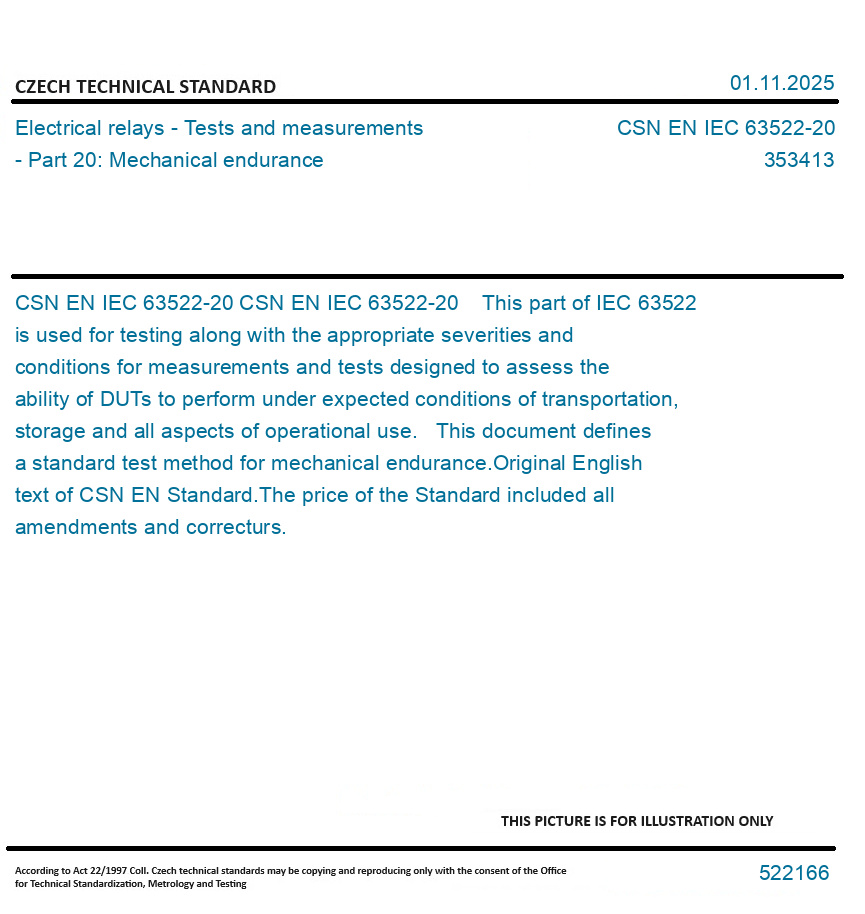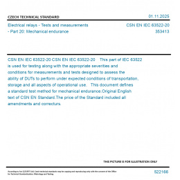 CSN EN IEC 63522-20 This part of IEC 63522 is used for testing along with the appropriate severities and conditions for measurements and tests designed to assess the ability of DUTs to perform under expected conditions of transportation, storage and all aspects of operational use. This document defines a standard test method for mechanical endurance. Original English text of CSN EN Standard. The price of the Standard included all amendments and correcturs.