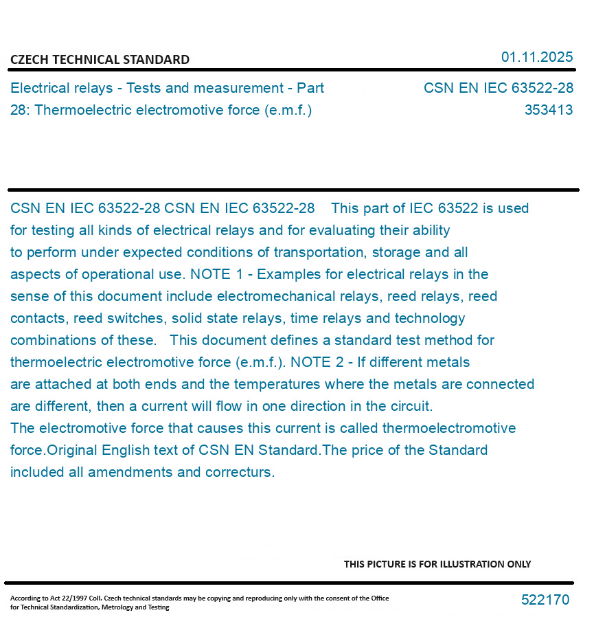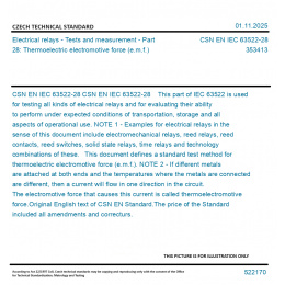 CSN EN IEC 63522-28 This part of IEC 63522 is used for testing all kinds of electrical relays and for evaluating their ability to perform under expected conditions of transportation, storage and all aspects of operational use. NOTE 1 - Examples for electrical relays in the sense of this document include electromechanical relays, reed relays, reed contacts, reed switches, solid state relays, time relays and technology combinations of these. This document defines a standard test method for thermoelectric electromotive force (e.m.f.). NOTE 2 - If different metals are attached at both ends and the temperatures where the metals are connected are different, then a current will flow in one direction in the circuit. The electromotive force that causes this current is called thermoelectromotive force. Original English text of CSN EN Standard. The price of the Standard included all amendments and correcturs.