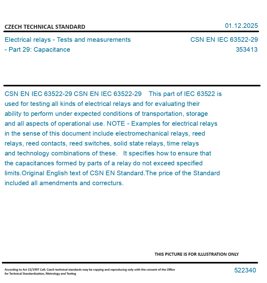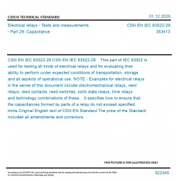 CSN EN IEC 63522-29 This part of IEC 63522 is used for testing all kinds of electrical relays and for evaluating their ability to perform under expected conditions of transportation, storage and all aspects of operational use. NOTE - Examples for electrical relays in the sense of this document include electromechanical relays, reed relays, reed contacts, reed switches, solid state relays, time relays and technology combinations of these. It specifies how to ensure that the capacitances formed by parts of a relay do not exceed specified limits. Original English text of CSN EN Standard. The price of the Standard included all amendments and correcturs.