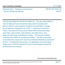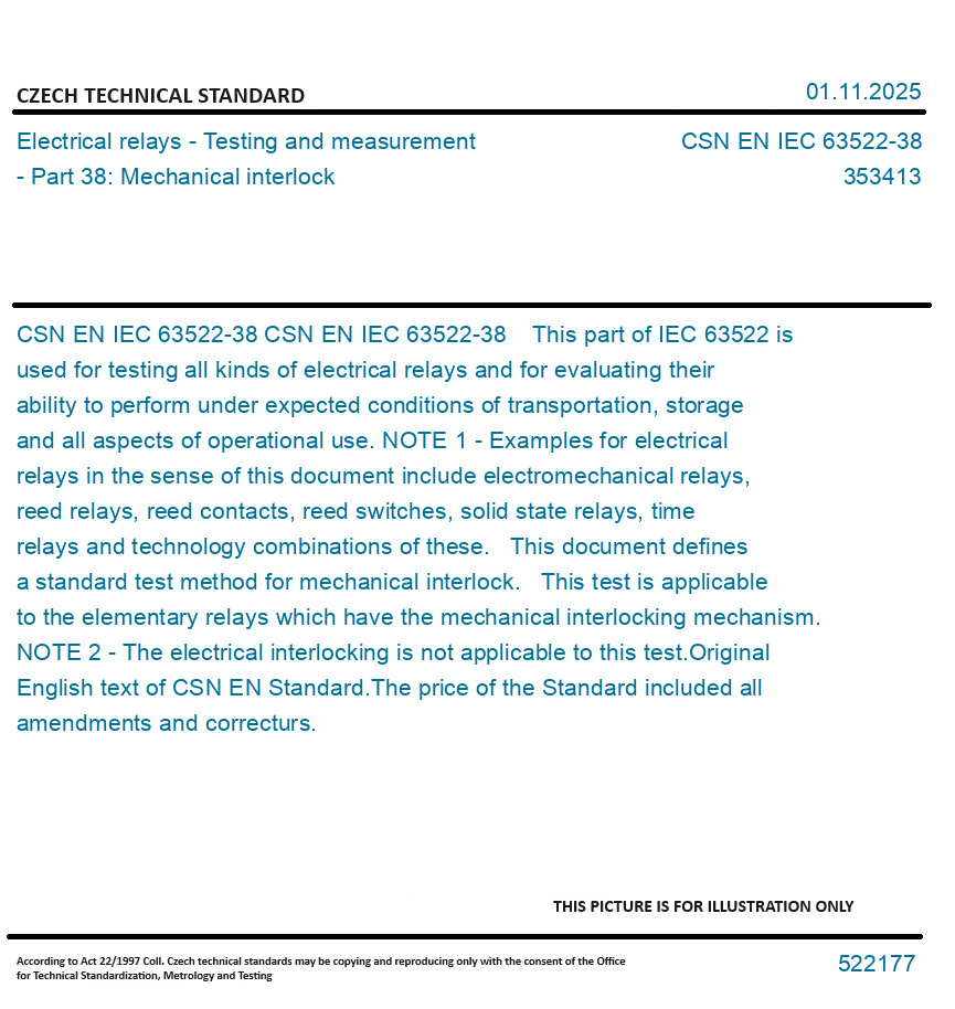 CSN EN IEC 63522-38 This part of IEC 63522 is used for testing all kinds of electrical relays and for evaluating their ability to perform under expected conditions of transportation, storage and all aspects of operational use. NOTE 1 - Examples for electrical relays in the sense of this document include electromechanical relays, reed relays, reed contacts, reed switches, solid state relays, time relays and technology combinations of these. This document defines a standard test method for mechanical interlock. This test is applicable to the elementary relays which have the mechanical interlocking mechanism. NOTE 2 - The electrical interlocking is not applicable to this test. Original English text of CSN EN Standard. The price of the Standard included all amendments and correcturs.