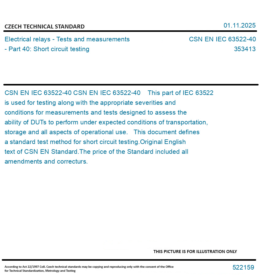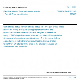 CSN EN IEC 63522-40 This part of IEC 63522 is used for testing along with the appropriate severities and conditions for measurements and tests designed to assess the ability of DUTs to perform under expected conditions of transportation, storage and all aspects of operational use. This document defines a standard test method for short circuit testing. Original English text of CSN EN Standard. The price of the Standard included all amendments and correcturs.