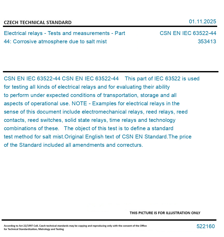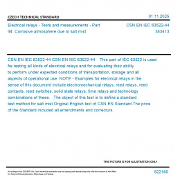 CSN EN IEC 63522-44 This part of IEC 63522 is used for testing all kinds of electrical relays and for evaluating their ability to perform under expected conditions of transportation, storage and all aspects of operational use. NOTE - Examples for electrical relays in the sense of this document include electromechanical relays, reed relays, reed contacts, reed switches, solid state relays, time relays and technology combinations of these. The object of this test is to define a standard test method for salt mist. Original English text of CSN EN Standard. The price of the Standard included all amendments and correcturs.