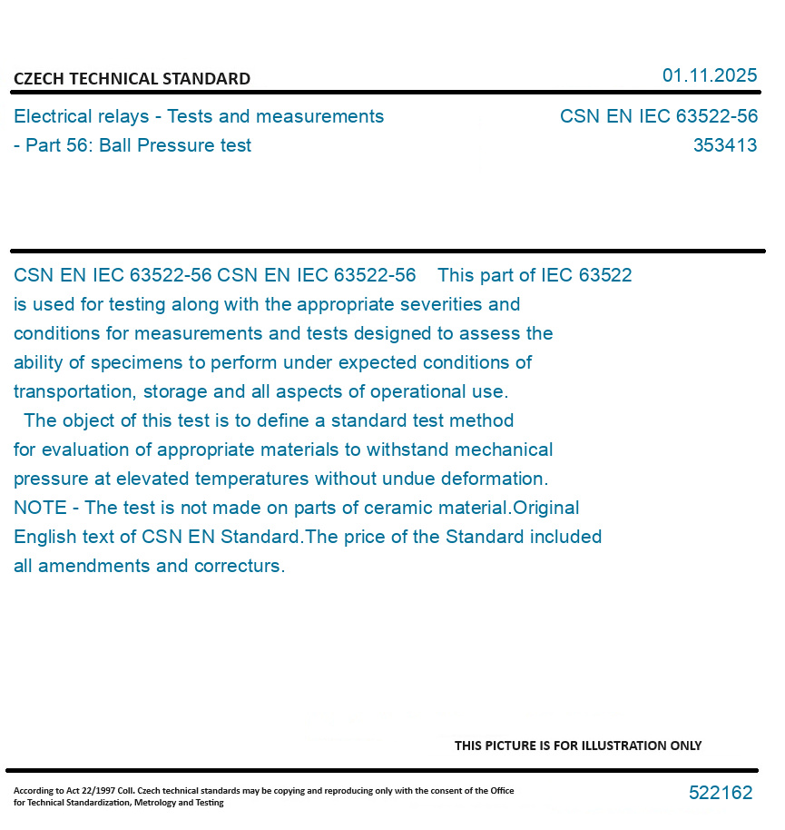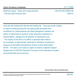 CSN EN IEC 63522-56 This part of IEC 63522 is used for testing along with the appropriate severities and conditions for measurements and tests designed to assess the ability of specimens to perform under expected conditions of transportation, storage and all aspects of operational use. The object of this test is to define a standard test method for evaluation of appropriate materials to withstand mechanical pressure at elevated temperatures without undue deformation. NOTE - The test is not made on parts of ceramic material. Original English text of CSN EN Standard. The price of the Standard included all amendments and correcturs.